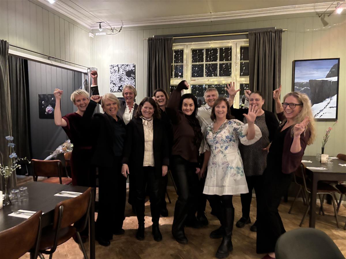 Fra venstre: Fremste rekke: Mona Kleiveland Fiskå, Liv Johanne Tjøsvoll, Linda Helmikstøl , Irene Heng Lauvsnes, Heidi Klaveness Bak : Camilla haug Flem, Elisabeth Bøe, Renate Egeland, Trond Leirflåt, Unn Helen SolliBåde ordføreren og kommunedirektøren holdt taler fulle av gode ord om innsatsen jubilantene har lagt ned gjennom alle disse årene som ansatte i Strand kommune.
