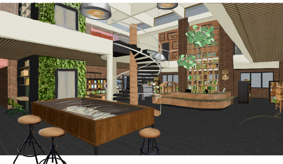 - Bibliotek i to etasjar, med formidlingsrom, folkeverksted og studieceller.