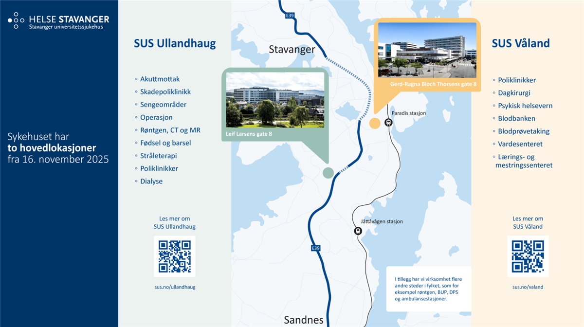 Stavanger universitetssykehus flytter 16. novemberFra og med 16. november får SUS to hovedlokasjoner, Våland og Ullandhaug. Sist endret 01.10.2025 14.39 Hvor finner jeg informasjon?Du finner alt informasjon du trenger på www.helse-stavanger.no.Der finner du også informasjon på flere språk.Nyttige snarveier:Time på sykehuset etter 16. november 2025Oversikt over byggeneSlik planlegger vi for flyttingAdkomst og parkering